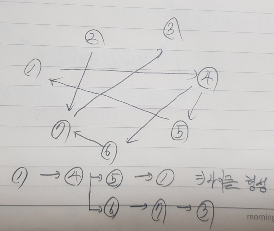 두 번째는 위의 예시 보다는 다소 복잡하지만 i에서 j로 가는 간선을 나타내보면 어떤 노드들끼리는 첫 번째 예시처럼 사이클을 형성하는 것도 있고 그렇지 않은 노드들도 있다.