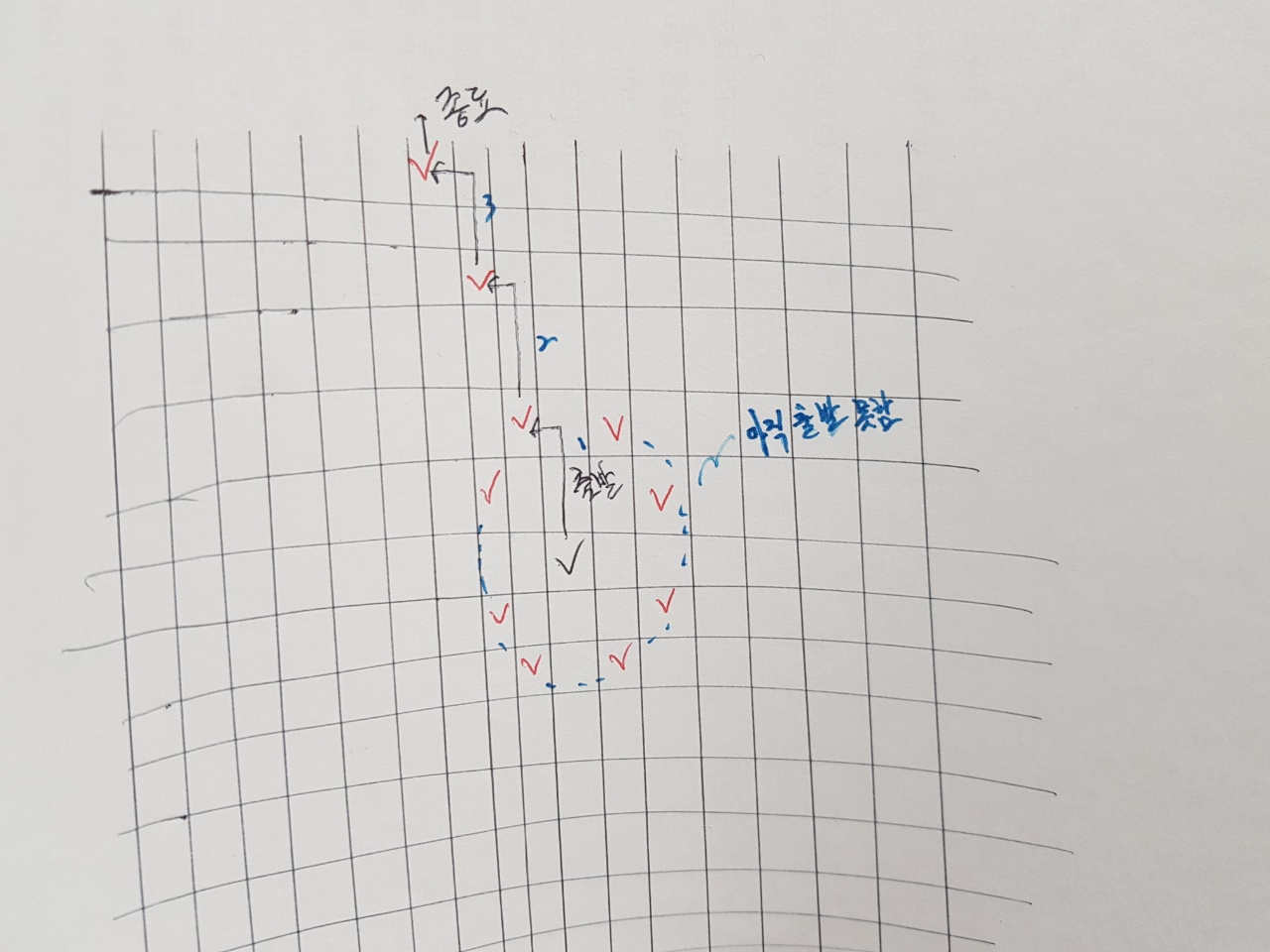 이렇게 나이트가 이동하다보면 체스판의 범위를 넘어가는 경우도 있을 것입니다. 이 경우에는 별도 방문 처리나 다음 탐색을 도모할 필요(Queue add)는 없으므로 그대로 다음 방향으로 탐색하도록 continue시킵니다.