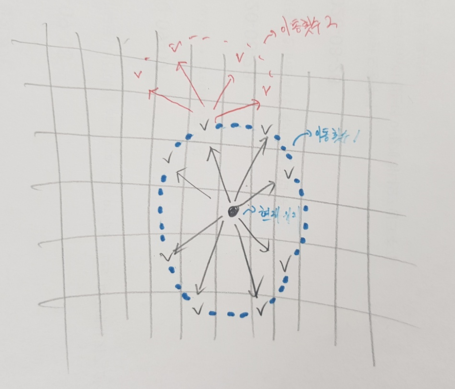 이런 식으로 현재 위치를 기준으로 8개의 방향으로 확장되어가는데, 이때 두드러지는 특징은 어느 하나의 경로가 다른 경로 보다 앞서 나가는 것이 아니라, 8개의 경로가 순차적으로 각각의 경로대로 한 칸씩 이동한 다음 모두 이동을 완료하면 다시 순차적으로(이 순서는 앞서 선언한 dx와 dy 좌표에 따라 결정됩니다.) 한 칸씩 이동한다는 점입니다. 즉, 현재 위치(노드)를 기준으로 자기 자신의 너비를 우선 탐색 즉, 우선적으로 간선으로 연결된 노드들을 순차적으로 모두 탐색하는 것입니다.