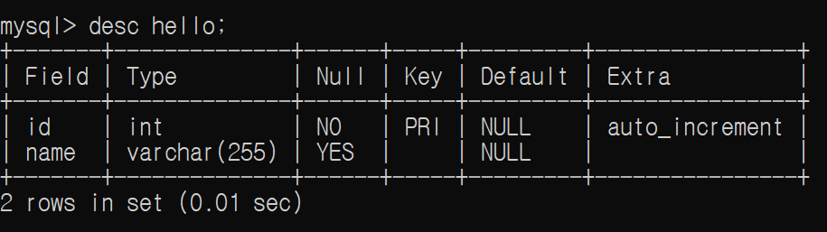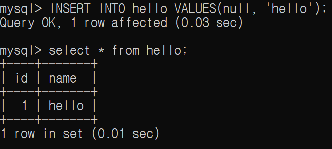 아울러 AUTO_INCREMENT가 적용된 id가 PRIMARY KEY로 지정된 것을 볼 수 있다. 이 역시 AUTO_INCREMENT를 적용하기 위해서는 반드시 적용되어야 하는 부분이다. PRIMARY KEY는 한 개 이상의 칼럼으로 테이블 내의 필드들을 구별하기 위해 사용된다. 따라서 PRIMARY KEY가 적용된 칼럼 값들 제각기 다르며, NULL 값을 가질 수 없다.