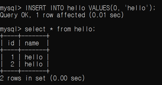 테스트 결과 분명히 id 값에 null을 할당했지만 1이 적용되는 것을 확인할 수 있다. 이는 앞서 NOT NULL 키워드가 영향을 주었기 때문이다. 이번에는 id 값에 0을 주입해보자.
