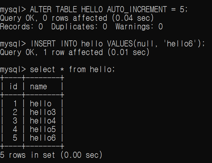 이때 관리 차원에서 중간에 비어진 곳을 메우고자 할 때 다음과 같은 방법으로 AUTO_INCREMENT 값을 재정렬할 수 있다.