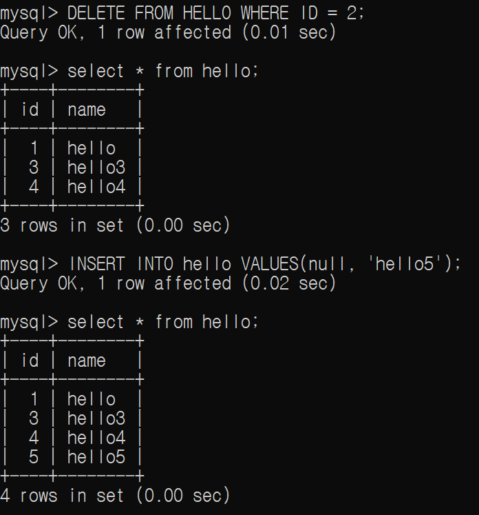 id에 0을 주입했지만 AUTO_INCREMENT 설정에 의해 순차적으로 할당되어진 것을 확인해볼 수 있다. 이러한 결과는 0을 먼저 주입하고 NULL을 주입해도 동일한 결과가 나온다. 하지만 아래와 같아 자동 오름차순으로 데이터들이 정렬되다가 중간에 삭제되는 데이터들도 있을 것이다. 이때 새로운 데이터를 다시 주입하게 되면 삭제되어 비어진 데이터 위치에 채워지는 것이 아니라 마지막 인덱스 번호 다음으로 새로운 데이터가 주입되게 되어진다.