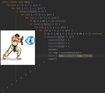 위 단계에서 제가 가장 구현하기 까다로웠던 부분은 "임의의 3개의 벽을 세우는 것"이었습니다. 사실 DFS나 BFS를 통해 임의의 3개의 벽을 세우는 것을 구현하고자 했었으나, 결국 구현하지 못하고 (오랜 시간 삽질 끝에...😂) 가장 원시적인 방법인 다중 for문을 통해 구현하고 말았습니다. 이로 인해 엄청난 depth가 발생하고 말았습니다.. 🤣