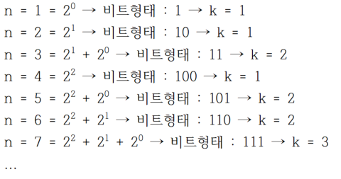 이렇게 나타내보니 n의 값과 그에 대한 최적의 해의 값인 k의 관계에 있어서 무언가 규칙이 존재하는 것을 발견할 수 있었습니다. 바로 1 비트의 개수가 k의 값이라는 것입니다.