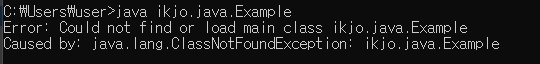 자바 실행기는 클래스패스(classpath)를 기준으로 클래스 파일을 찾는데, 클래스패스(classpath)란 자바 실행기, 컴파일러, JVM 등이 클래스 파일의 위치를 찾는데 사용되는 경로이다. 이때 별도로 클래스패스를 지정하지 않을 경우 기본적으로 현재 디렉토리(.)가 클래스패스로 지정된다. 즉, 명령 프롬프트 기준으로 현재 위치는 "C:\User\user"에 해당되므로 "C:\User\user\ikjo\java\Example.class"에 해당하는 클래스 파일이 존재하는지 찾는 것이다.