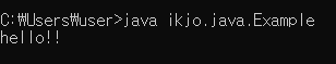 앞서 생성한 ikjo.java.Example 클래스 파일을 자바 실행기(java.exe)로 실행시켜보자.