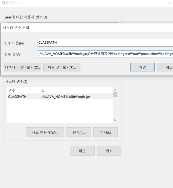 Windows 10 기준 '시스템 속성 - 고급 - 환경 변수 - 시스템 변수'에서 '새로 만들기' 또는 '편집'을 통해 CLASS라는 시스템(환경) 변수의 값에 "C:\인텔리제이\codingtest\out\production\codingtest"을 할당해주면된다.