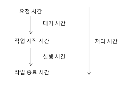 예를 들어, 동시에 요청된 작업인 A(작업 시간이 10초)와 B(작업 시간이 20초)가 있다고 가정해보겠습니다. 만일 B가 먼저 실행된다면, B의 처리 시간은 20초(대기 시간 0초, 실행 시간 20초)이겠으나, A의 처리 시간은 30초(대기 시간 20초, 실행 시간 10초)로, 처리 시간 평균은 25초입니다.