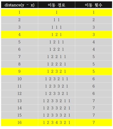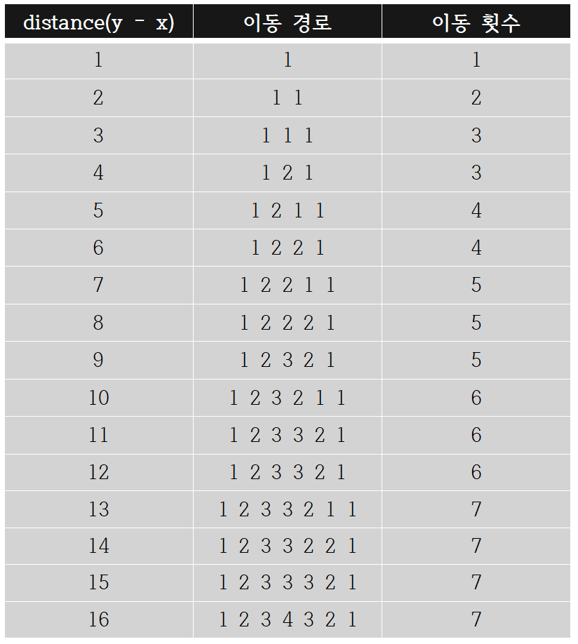 우선 주어지는 x 좌표와 y 좌표 사이의 거리(y - x) 일부(1 ~ 16)에 대해 공간 이동 장치 작동 횟수(이하 '이동 횟수')의 최솟값을 일일이 구해 나타내보면 다음과 같습니다.