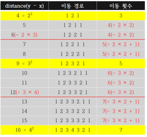 이때 중간을 나누는 값의 기준은 자기 자신(거리) '보다 작은 제곱수'와 '보다 큰 제곱수'를 곱한 값으로 이보다 같거나 작으면 자기 자신 보다 작은 제곱수에 2를 곱한 값이 이동 횟수이며, 보다 크면 자기 자신 보다 작은 제곱수에 2를 곱한 후 1을 더한 값이 이동 횟수가 됩니다.
