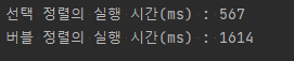 빅오 표기법 상의 시간 복잡도는 O(N^2)로 같지만 선택 정렬이 버블 정렬보다 확연히 시간 성능이 낫다는 것을 확인할 수 있다.