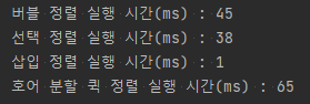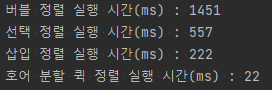 성능 비교를 위해 다음과 같이 3만개의 무작위 정수형 배열로 버블 정렬, 선택 정렬, 삽입 정렬, 호어 분할 방식의 퀵 정렬의 실행 시간을 측정해보았다.