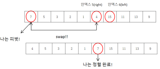 이렇게 피벗을 기준으로 swap을 해주다보면 left가 right 보다 커지는 순간이 발생한다. 이때 right의 데이터 값과 피벗을 swap 해주는데, 이미 피벗을 기준으로 왼쪽에 작은 값들을, 오른쪽에 큰 값들을 위치시켜놨으므로, 피벗의 새로운 위치(right)는 정렬이 되어있다고 생각할 수 있다.
