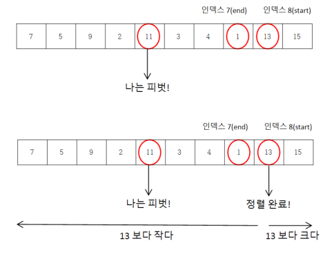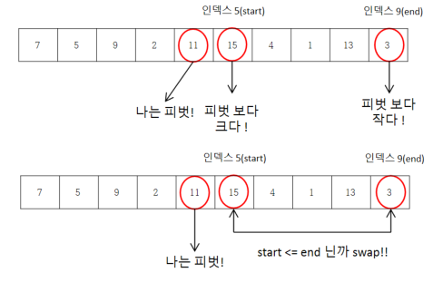 이렇게 피벗을 기준으로 swap을 해주다보면 start가 end 보다 커지는 순간이 발생한다. 이때 앞선 작업들로 인해 start 기준 왼쪽에는 start 값 보다 작은 값들이, start 기준 오른쪽에는 start 값 보다 큰 값들이 존재하게 되므로 현재 start 지점은 영역을 나누는 기준점이 되며, 아울러 정렬이 되어있는 상태라고 볼 수 있다.