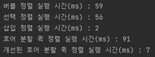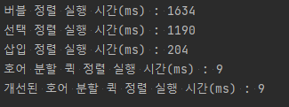 실행 결과 기존 퀵 정렬과 개선된 퀵 정렬 간 시간 성능적으로 유의미한 차이는 없었다.