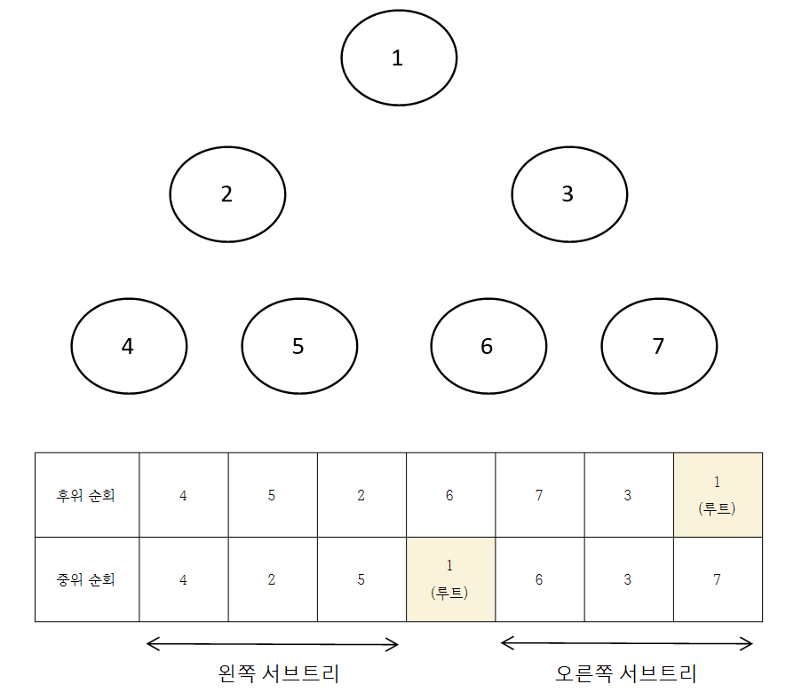 이때 중위 순회 결과 상 루트 노드 이전에 순회했던 노드들은 루트 기준 왼쪽 서브 트리에 해당되며, 루트 노드 이후에 순회되는 노드들은 루트 기준 오른쪽 서브 트리에 해당됩니다.