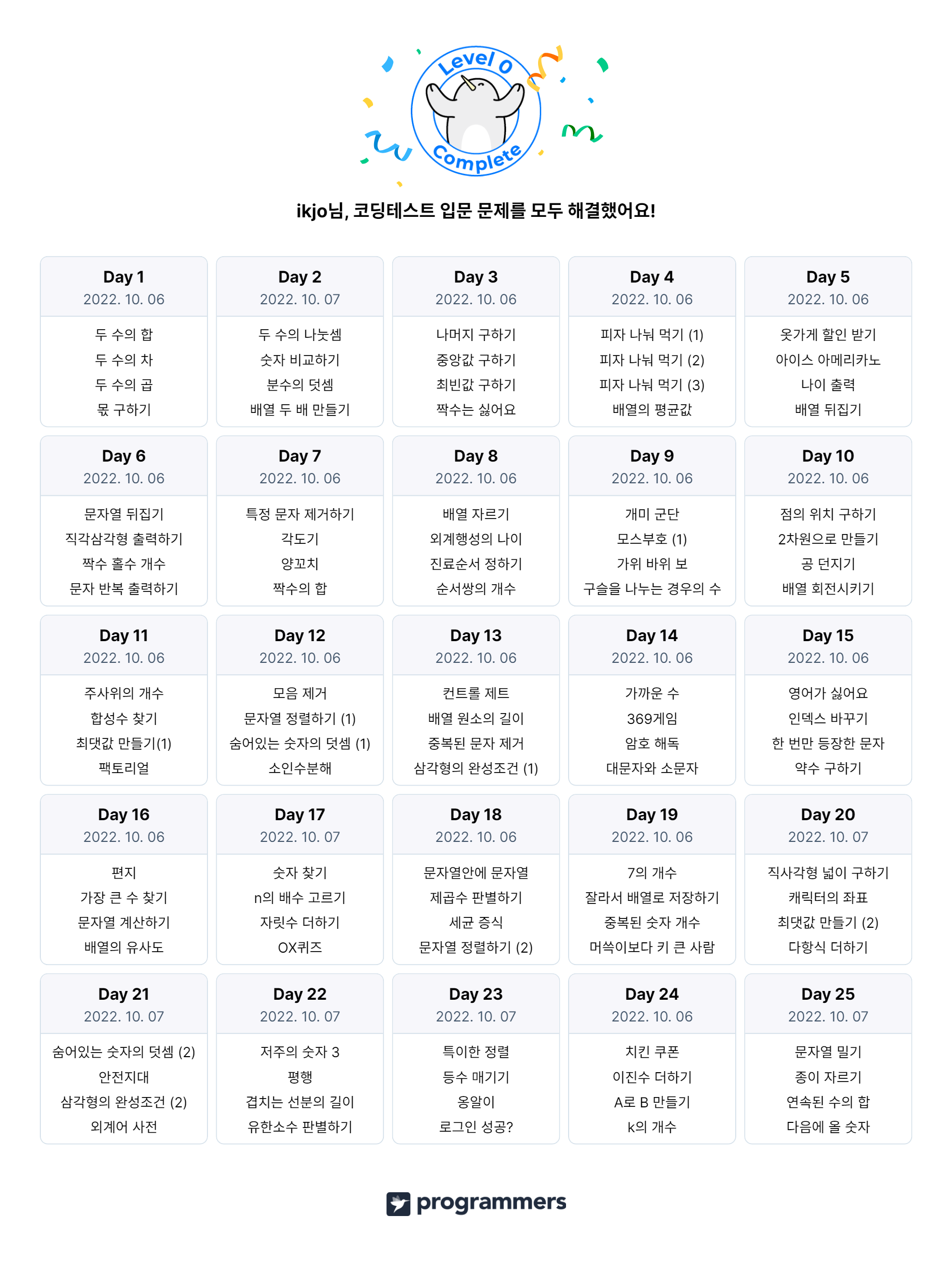 최근 프로그래머스에 신규 알고리즘 문제들이 많이 생겨, 해당 문제들을 풀어보았다. 특히, 그 중에는 코딩테스트 입문용인 Level 0의 문제들이 100문제나 있었다. 개인적으로 일종의 강박증(?)이 있어 프로그래머스 레벨 3까지의 모든 알고리즘 문제들을 다 풀고 싶다는 생각이 있어 하루 날 잡고 모든 문제를 풀었다.