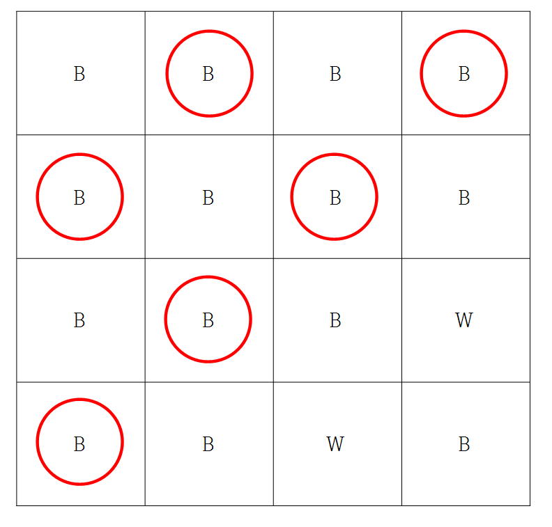 우선 처음 격자가 B로 시작하는 경우에는 아래 표시된 영역에 대해 다시 칠해야 합니다.