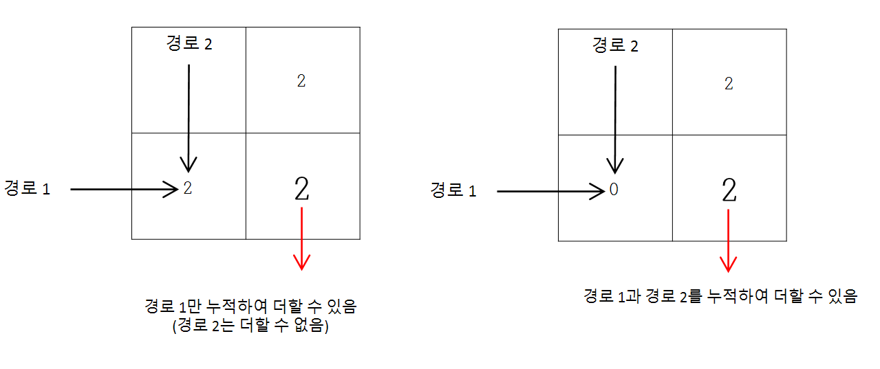 먼저 현재 순회 지점이 빈 지점인데다가 왼쪽 값과 위쪽 값까지 모두 빈지점이라면 단순히 경로를 더해주면 됩니다. 하지만 이때 왼쪽 값과 위쪽 값이 직진만 가능한 지점이라면 아래와 같이 나눠서 더해주어야 합니다.