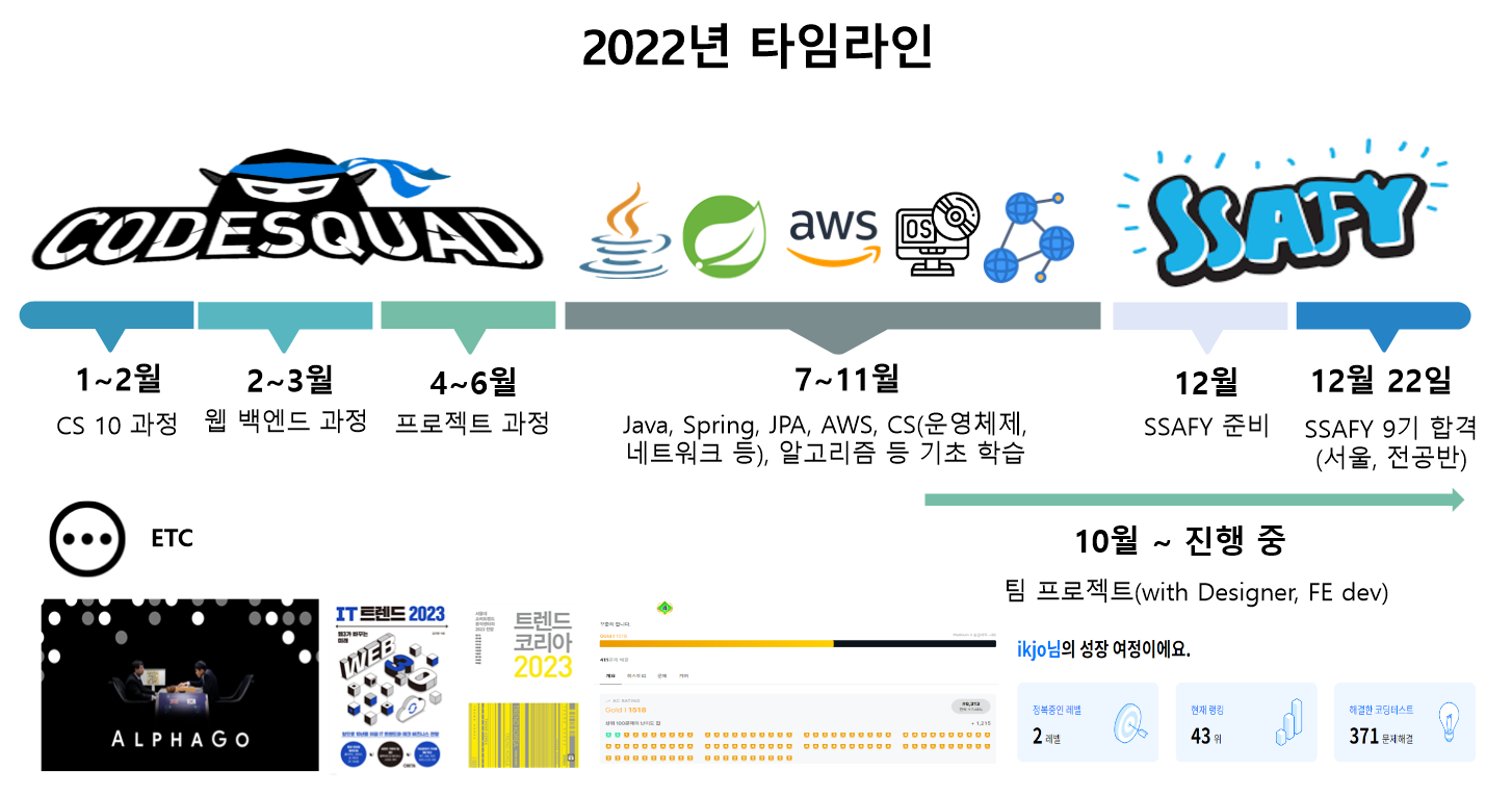 회고를 작성한다는 것은 상당한 시간이 소요되는 부분이긴 하지만, 개인적으로 지난 한 해에 대한 회고를 작성하는 것은 앞으로 개발자로서 성장하는데 있어 자양분이 되어준다고 생각하기에 회고 작성을 마무리하고 싶다는 생각이 들었다. 사실 2022년에 대한 회고 작성을 2022년이 가기 전에 마무리하고싶었으나, 2022년 연말에 운이 좋게 SSAFY에 합격하여 급하게 자취방을 구하는 등 여러모로 정신이 없었기에 작성이 많이 늦어졌다. 😭
