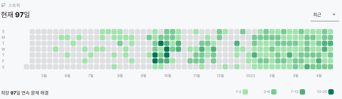 하지만, 시간이 지남에 따라 기업 코딩테스트에서 요구하는 알고리즘 역량이 점점 올라가고 있는 추세(알고리즘 상향 평준화)에 있다. 따라서 알고리즘 문제 풀이를 소홀히 할 수는 없는 노릇이기에, 현재 SSAFY 교육생들과 함께 진행하고 있는 알고리즘 스터디를 꾸준히 하고자 한다. 아울러 어떤 문제를 해결한다고 끙끙대며 몇시간 흘려보내기 보다 모를 때에는 과감하게 넘어가거나 문제 풀이를 위한 아이디어 내지 해답을 확인하고자 한다. 무엇보다 장기적으로 꾸준하게 알고리즘 문제를 풀고자 하기에 백준 1일 1커밋 운동을 계속 이어나갈 생각이다. 🏃♂️