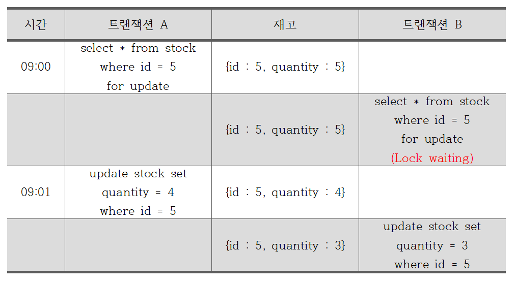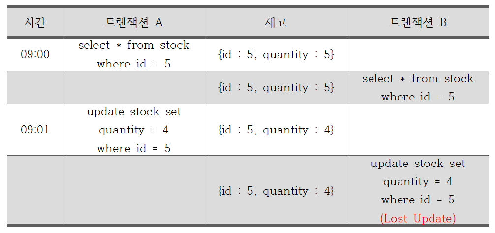 위 상황에서는 트랜잭션 격리수준을 Serializable 로 하지 않았을 때를 상정한 것이다. 위 시나리오를 보면 데이터베이스 상에서 동일한 레코드에 대해 변경 작업(재고 1 감소)을 시도하는 서로 다른 트랜잭션 A 와 트랜잭션 B 가 거의 동시에 처리될 때, 트랜잭션 B 의 변경작업이 유실(Lost Update)되는 이슈가 발생한다는 것을 예측할 수 있다.