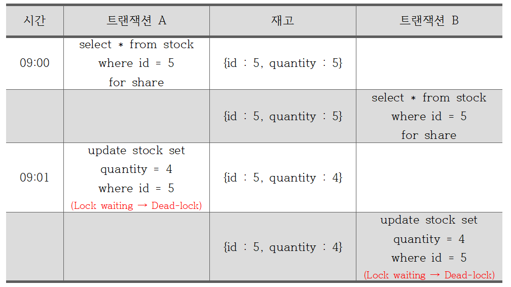 그렇기 때문에 트랜잭션 A 가 id = 5 에 해당하는 레코드에 대해 공유 잠금을 동반한 읽기를 했을 때, 트랜잭션 B 역시 해당 레코드에 대해 공유 잠금을 동반한 읽기를 할 수 있는 것이다. 하지만, 트랜잭션 A 가 해당 레코드에 대해 변경 작업을 하려는 순간 트랜잭션 B 가 건 공유 잠금 때문에 Lock waiting 에 빠지게 되며, 트랜잭션 B 역시 변경 작업 수행 시 앞서 트랜잭션 A 가 건 공유 잠금 때문에 Lock waiting 에 빠지게 된다. 즉, 데드락(Dead-lock)이 발생하게 된다.