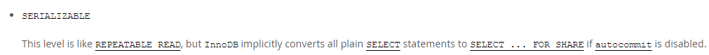 MySQL 공식문서를 살펴보면, Serializable 의 경우 Repeatable Read 의 특성을 그대로 따르면서 모든 평이한 SELECT 작업 시 공유 잠금(shared lock)을 사용한다는 것을 확인할 수 있다.