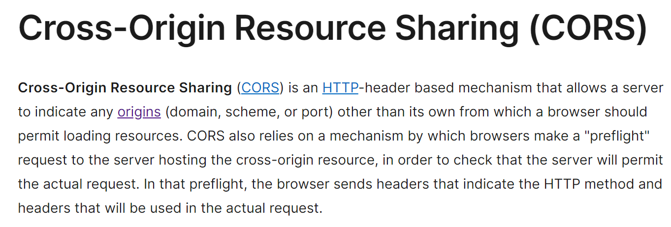 앞서 팀 프로젝트 당시 클라이언트 측에서 서버 API 를 호출했을 때 CORS 이슈가 발생했었던 것은 이러한 브라우저의 SOP 때문인 것이다. 사실, CORS 이슈라고 불리기는 하지만, (마치 CORS 가 막아버리는 듯한 느낌이 들지만) CORS 는 Cross Origin Resource Sharing 의 약어로 HTTP 응답 헤더 Access-Control-Allow-Origin 기반으로 브라우저의 SOP 정책을 bypass 해주는 매커니즘이다. 대표적으로 Preflight Request 가 있다.