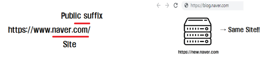 SOP 를 다룰 때 Same Origin 과 Cross Origin 으로 구분했었던 것과 달리, 여기서는 Same Site 와 Cross Site 으로 구분한다. 여기서 Site 란 public suffix(com, co.kr, org, net, github.io 등) 기준 한 단계 하위 도메인까지만을 나타내는 것으로 Origin 과는 다소 차이가 있다.
