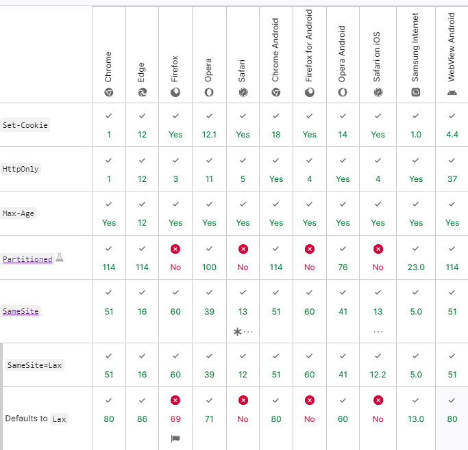 위 표를 보면, 모든 브라우저에서 SameSite 속성을 지원하긴 하나, 이에 대한 기본 속성을 Lax 로 하냐 안하냐는 브라우저별로 상이하다. 즉, 개발자는 쿠키를 사용 용도에 따라 분리하고 명확하게 SameSite 의 속성을 명시해줄 필요가 있다고 생각한다. 예를 들어, Lax 속성의 경우 a 태그를 통해서 요청 시 쿠키 전송이 가능하기에 해당 쿠키를 수반한 요청의 경우 서버 리소스를 변경하면 CSRF 공격에 위험하다. 피치 못하게 SameStie 속성을 None 으로 해야한다면 앞서 잠시 언급했었던 CSRF 방지 토큰을 사용하는 방법도 있다.