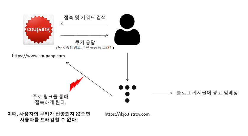 어떤 사용자가 쿠팡을 이용하다 쿠팡 서버로부터 받은 쿠키가 있는데, 티스토리 블로그 글들을 구경하다가 무심코 글에 임베딩된 쿠팡 광고를 누르는 경우가 있는데, 이러한 광고 배너는 주로 링크를 통해 접속하게 된다. 이때, 쿠팡 입장에서는 티스토리라는 Site 에서 쿠팡 이라는 Site 로 쿠키를 전송하지 못하게 되면 사용자를 트래킹할 수 없다. 이러한 경우 SameSite 속성을 Lax 로 설정해볼 수 있다.