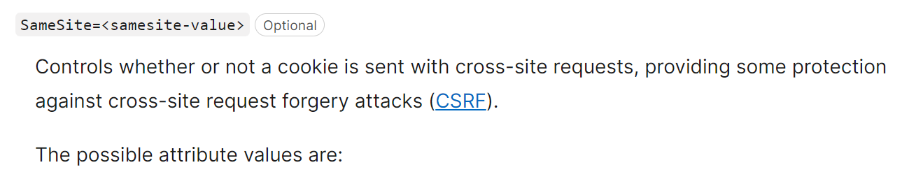 이때, SameSIte 는 쿠키에 부여되는 속성 값으로서 None 과 Lax 그리고 Strict 가 있으며, 이러한 각각의 속성별로 cross site context 에서 쿠키 전송 유무를 제어할 수 있다. 이러한 특성으로 쿠키를 기반으로 하는 CSRF 공격에 대비하여 SOP 의 한계를 보완할 수 있다.