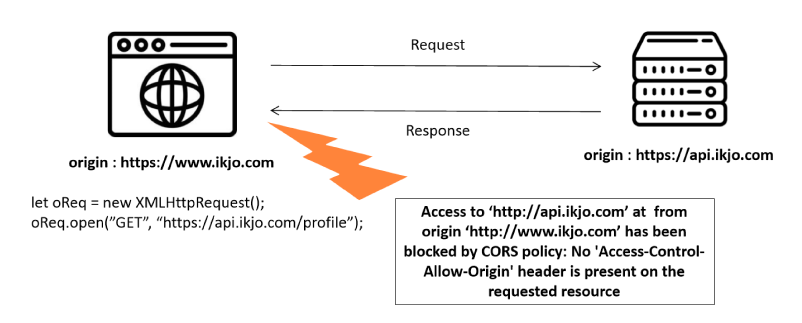 전형적인 CORS 이슈 시나리오이다. https://www.ikjo.com 이라는 origin 으로부터 로드된 document 또는 script 에서 https://api.ikjo.com 이라는 origin 에 GET 요청을 보내는 상황이다. 이때, 브라우저의 SOP 정책에 의해 우리가 자주 목격했었던 "... blocked by CORS policy : No ..." 콘솔 로깅과 함께 서버가 응답한 리소스를 브라우저가 차단하여 클라이언트는 해당 리소스에 접근할 수 없게 된다.