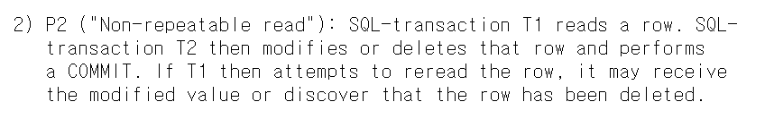 MySQL 의 InnoDB 스토리지 엔진에서 기본으로 사용되는 트랜잭션 격리수준은 Repeatable Read 이다. 이때 Repeatable Read 에서는 다른 트랜잭션 격리수준인 Read Uncommitted 나 Read Committed 에서와 달리 Non-Repeatable Read 현상이 발생하지 않는다. 여기서 Non-Repeatable Read 란 하나의 트랜잭션에서 같은 값을 두 번 select 했을 때 각각 다른 값이 읽히는 현상이다. 참고로 ANSI SQL 1992 에서는 Non-Repeatable Read 현상을 아래와 같이 서술하고있다.