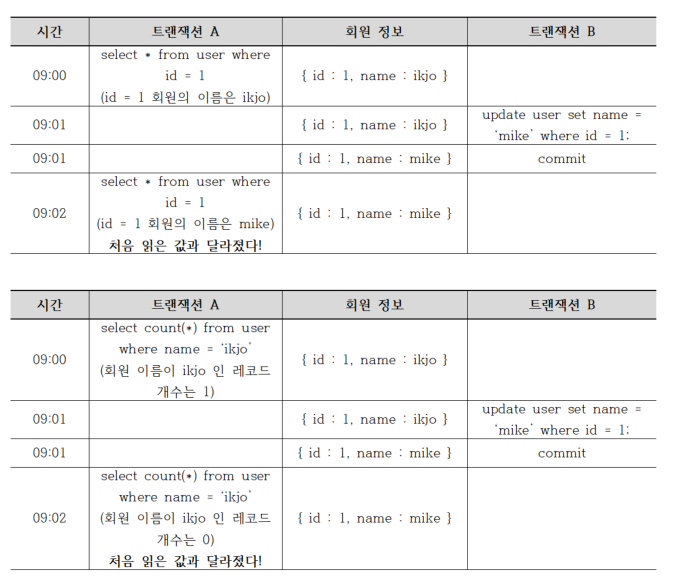 위 예시는 많은 자료에서 예시로 사용되고 있는 Non-Repeatable Read 발생 시나리오이기도 하다.