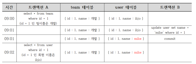 가장 먼저 트랜잭션 A 는 team 테이블에서 id = 1 인 데이터를 조회하고 뒤 이어 트랜잭션 B 가 user 테이블에서 id = 1 인 데이터를 수정하고 커밋했다. 이후 트랜잭션 A 가 user 테이블에서 id = 1 인 데이터를 조회했는데, 놀랍게도 트랜잭션 B 가 수정(ikjo → mike)하고 커밋 처리를 했음에도 불구하고 더욱이 트랜잭션 A 가 한번도 조회하지 않았던 user 테이블의 원본 데이터(ikjo)이 조회가 된 것이다.