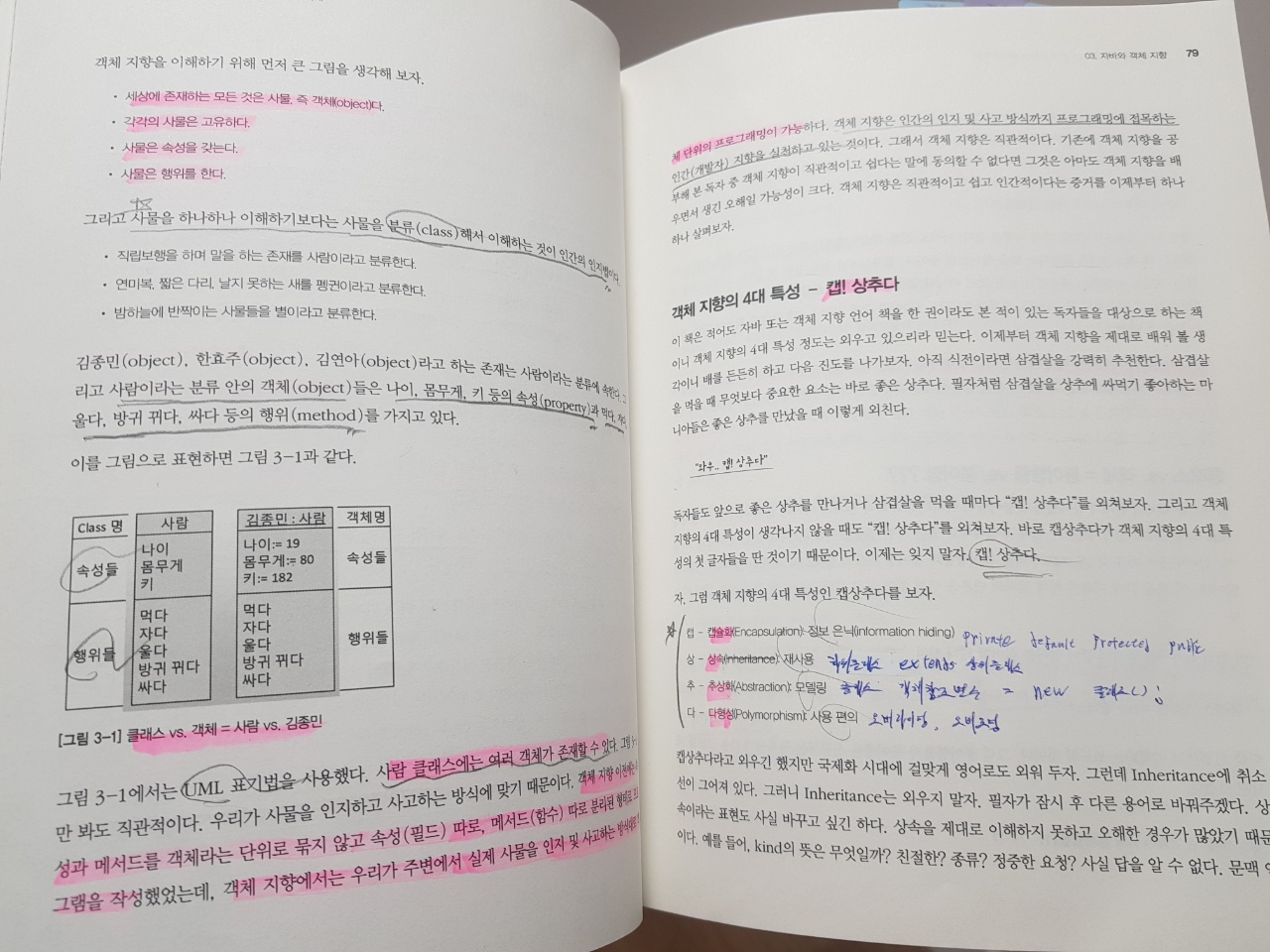 이때 자바의 객체 지향 프로그래밍을 이해하는데 도움을 많이 받았던 책은 위키북스 출판의 "스프링 입문을 위한 자바 객체 지향의 원리와 이해"라는 책이었습니다. 특히, 이 책의 "자바가 확장한 객체 지향 파트"와 "객체 지향의 4대 특성" 부분은 지금도 한번씩 보고있습니다.