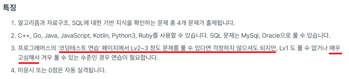 프로그래머스 문제를 푸는 중 마침 프로그래머스에서 "2021 Dev-Matching: 웹 백엔드 개발자(하반기)_진짜마지막" 챌린지 공고를 확인했는데, 이는 프로그래머스에서 작성한 이력서 한 장으로 다양한 기업에 동시 지원할 수 있는 채용 프로그램이었습니다. 하지만 앞서 알고리즘 테스트가 진행되는데 다음 안내문에 문구가 마음에 걸렸습니다. 비록 Level 1의 문제를 모두 푼 상태이긴 했으나 아직 Level 2 문제를 진행 중인 상태였고, Level 1 문제들 중에서도 몇몇 문제는 고심해서 풀었기 때문입니다.