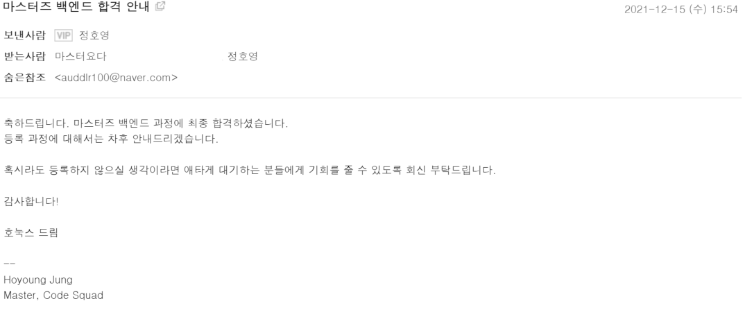 이때 이전의 경험 덕분에 훨씬 더 나은 글을 작성할 수 있었습니다. 2차 평가는 30분간 Java 웹 백엔드 과정의 마스터 호눅스와의 다대일 면접으로 진행되었고 2차 평가 역시 다행히 합격할 수 있었고 최종적으로 코드스쿼드 2022 마스터즈 코스 Java 웹 백엔드 과정에 합류할 수 있었습니다.