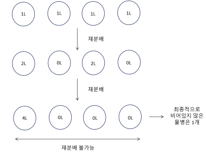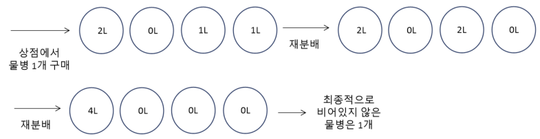 그렇다면 N개의 물병을 재분배하는 과정을 먼저 살펴보겠습니다.