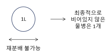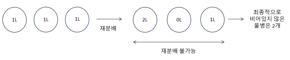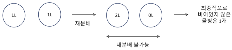 하지만 물병의 개수가 홀수라서 2로 떨어지지 않는 경우(나머지가 1인 경우)도 있습니다. 앞서 6개의 물병을 재분배한 결과로 2L의 물병이 3개가 되는데, 이때 2개의 물병은 짝지어지지만 나머지 1개의 물병은 짝지어지지 못합니다. 이 물병은 앞으로 재분배됨으로써 새롭게 생기는 물병과 용량이 같아질리가 없으므로 최종적으로 비어있지 않은 물병(2L)으로 남아있을 것입니다.